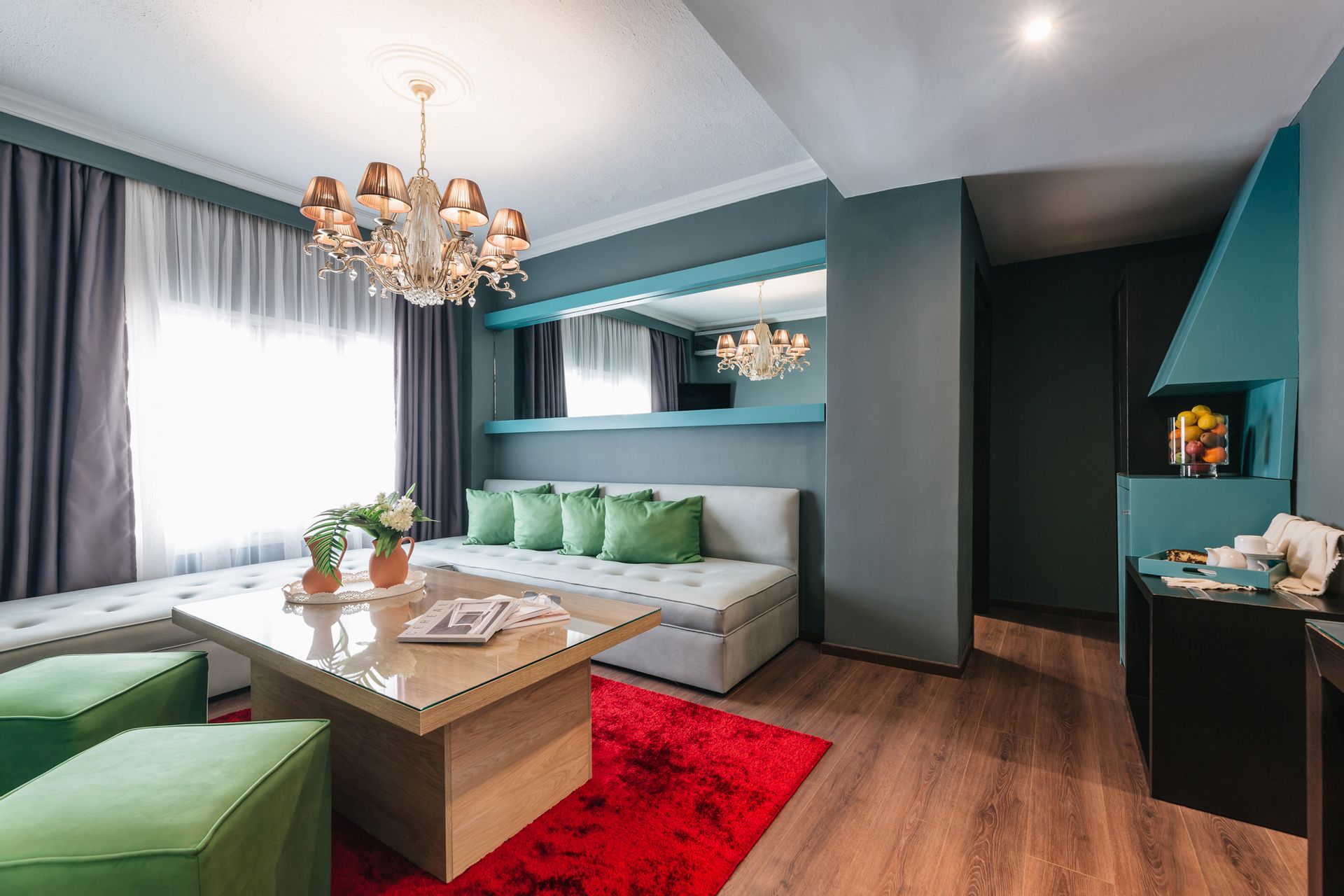 Large comfortable Suites of 35 sq.m. Every Suite features a double bed and a sitting area with two sofas.