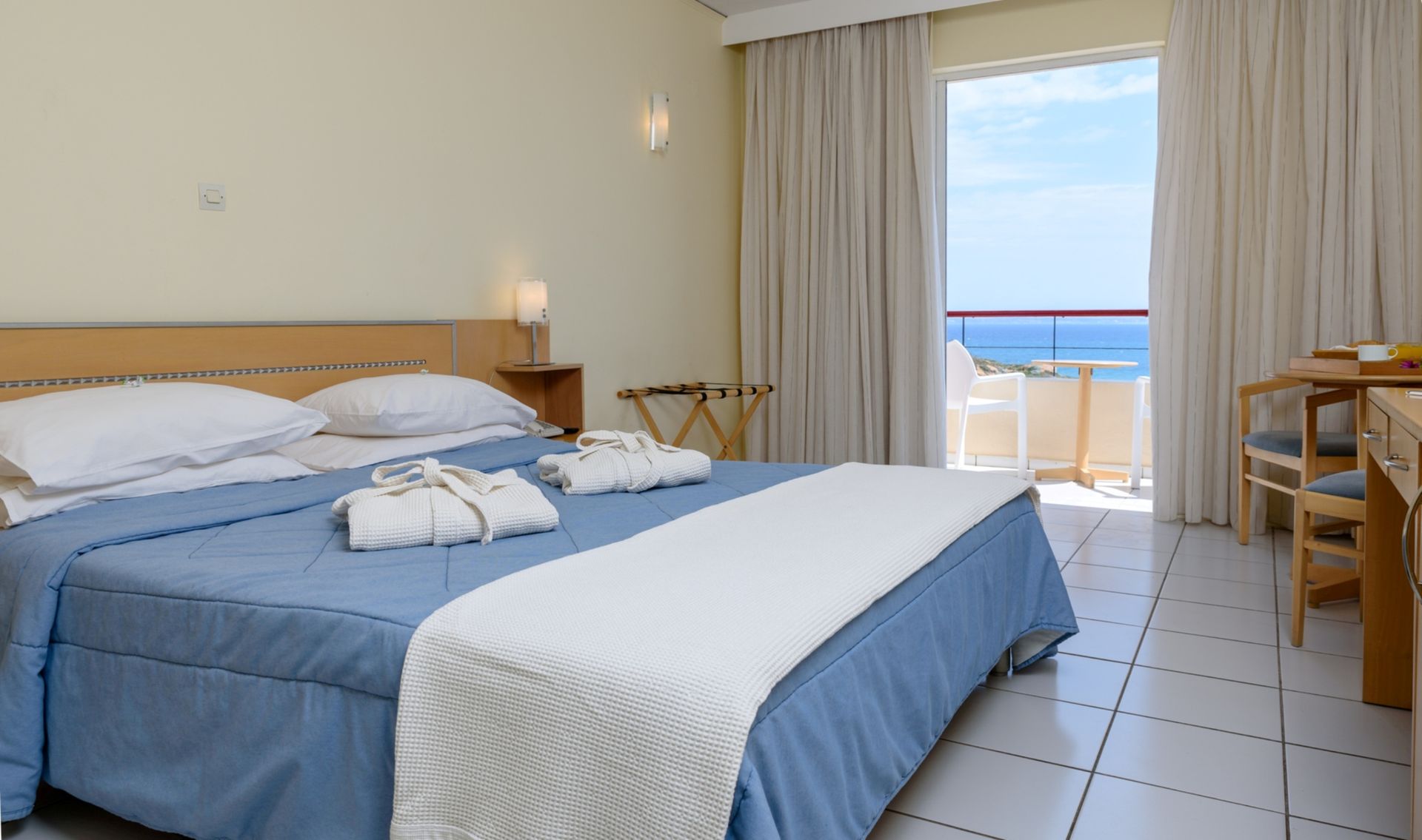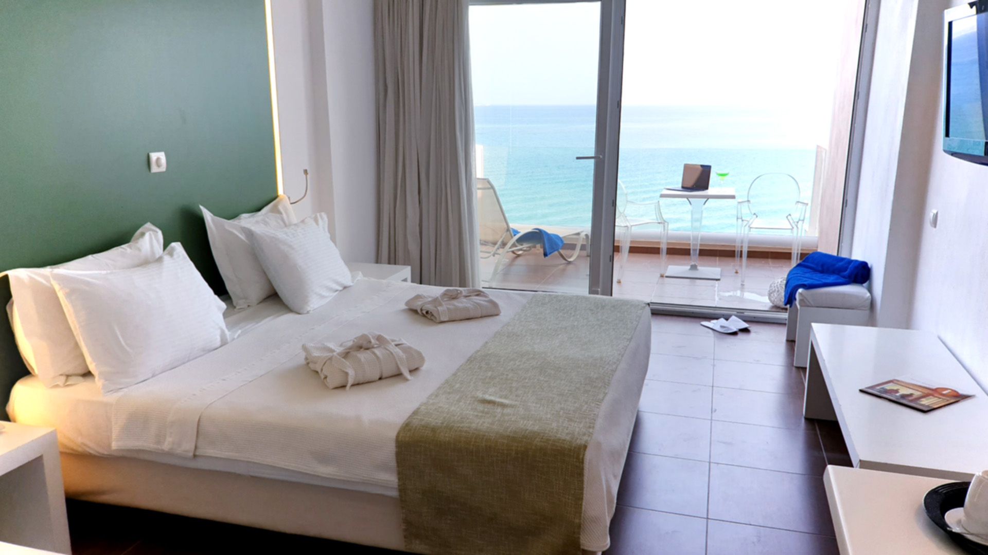 Deluxe Double Sea View Rooms literally overlook the sea and combine elegance with comfort. These modern equipped rooms invite guests...