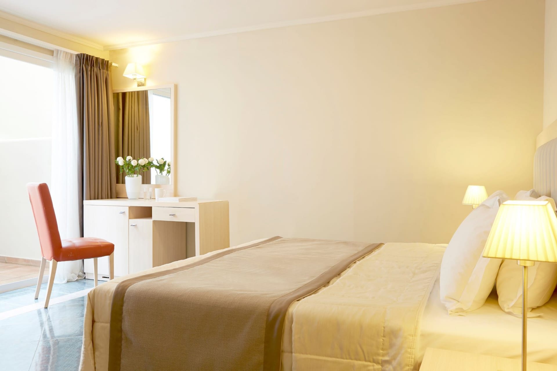 Pelekas Monastery is a five-star hotel located directly on Kontogialos Beach in Pelekas, Corfu. The property features 189 rooms with contemporary design, many offering panoramic views of the Ionian Sea and surrounding coastal landscape. Accommodations are designed with modern convenience, providing a comfortable atmosphere for guests. The hotel is positioned on a sandy beach along Corfu's western coast, offering immediate access to the water and beachfront activities. On-site restaurants and bars serve local and international cuisine. The property includes upscale services and facilities suitable for all ages, with practical details such as parking and airport transfers typically available. The hotel is approximately 14 kilometers from Corfu Town and the airport, maintaining a coastal setting while remaining accessible. The surrounding area features green landscapes and walking paths, with proximity to the village of Pelekas known for its traditional character and viewpoints. Other coastal areas are within a short driving distance. This beachfront hotel combines direct sea access with modern accommodations in a strategic location.