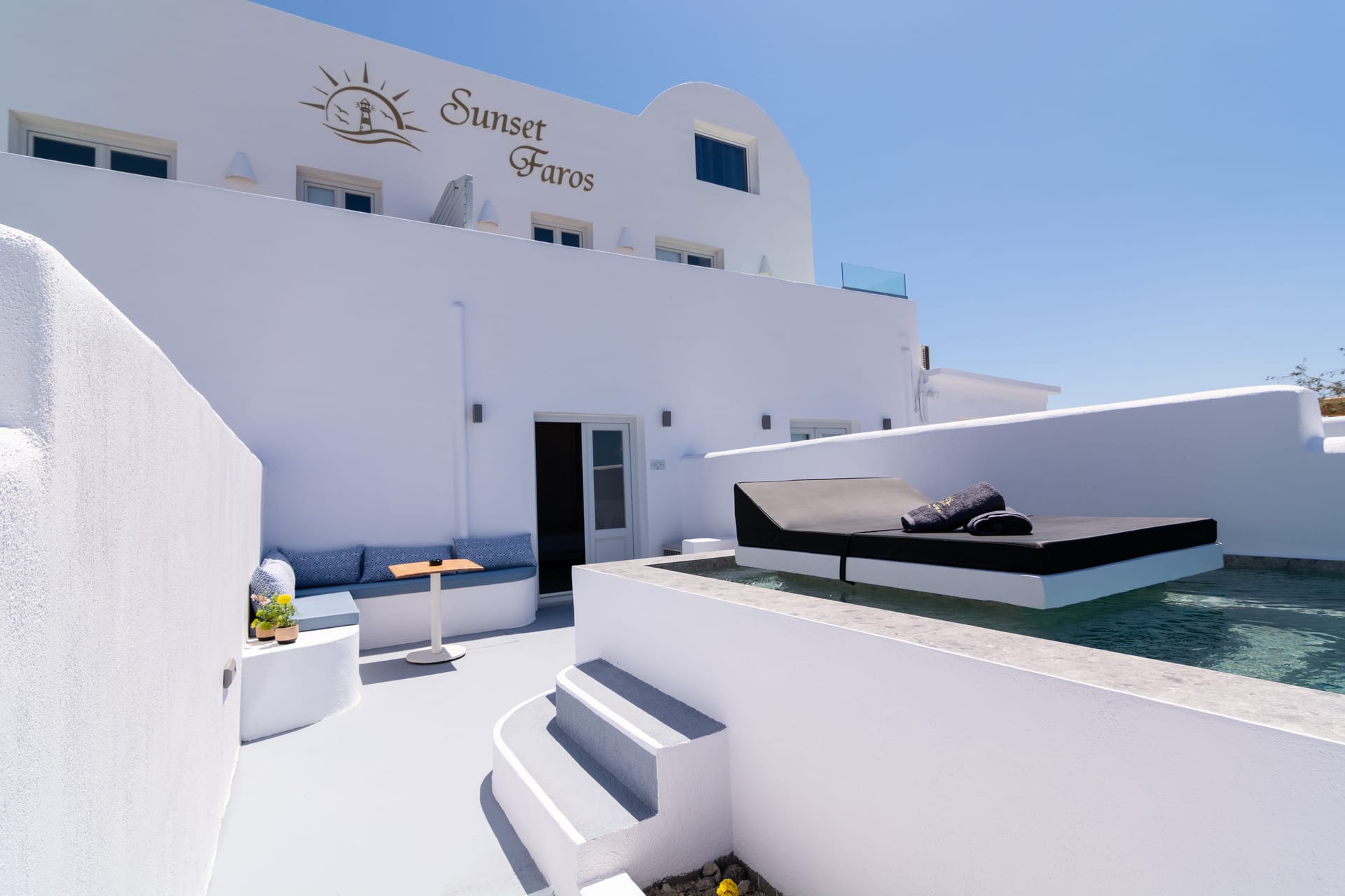 Sunset Faros Santorini is a hotel complex located in Akrotiri village on Santorini. The property consists of 10 rooms, offering an intimate accommodation setting. The hotel provides views of the Aegean Sea and the volcano from its position. The property is situated approximately 15 minutes by car from the port of Santorini and about 20 minutes from Santorini International Airport. The hotel has a 3-star rating. The accommodation is positioned in proximity to the beach area, with distance categories including on the beach, up to 50 meters, up to 100 meters, up to 200 meters, up to 300 meters, up to 400 meters, up to 500 meters, up to 600 meters, up to 1000 meters, and up to 2000 meters. The location also offers mountain and city accommodation options within these distance ranges. The property is part of the Cyclades island complex in the Aegean Sea region.